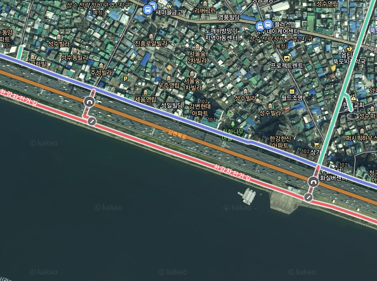 서울에서 능소화가 유명한 곳은 뭐니뭐니해도 뚝섬유원지에서부터 뚝도시장으로 이어지는 한강길 주변입니다. 지도상으로는 아래 지도에서 빨간 길이 살짝 삐져나와 있는 곳 (한강 공원 나가는 굴다리) 2개의 사이 지점이 최고의 명소입니다.